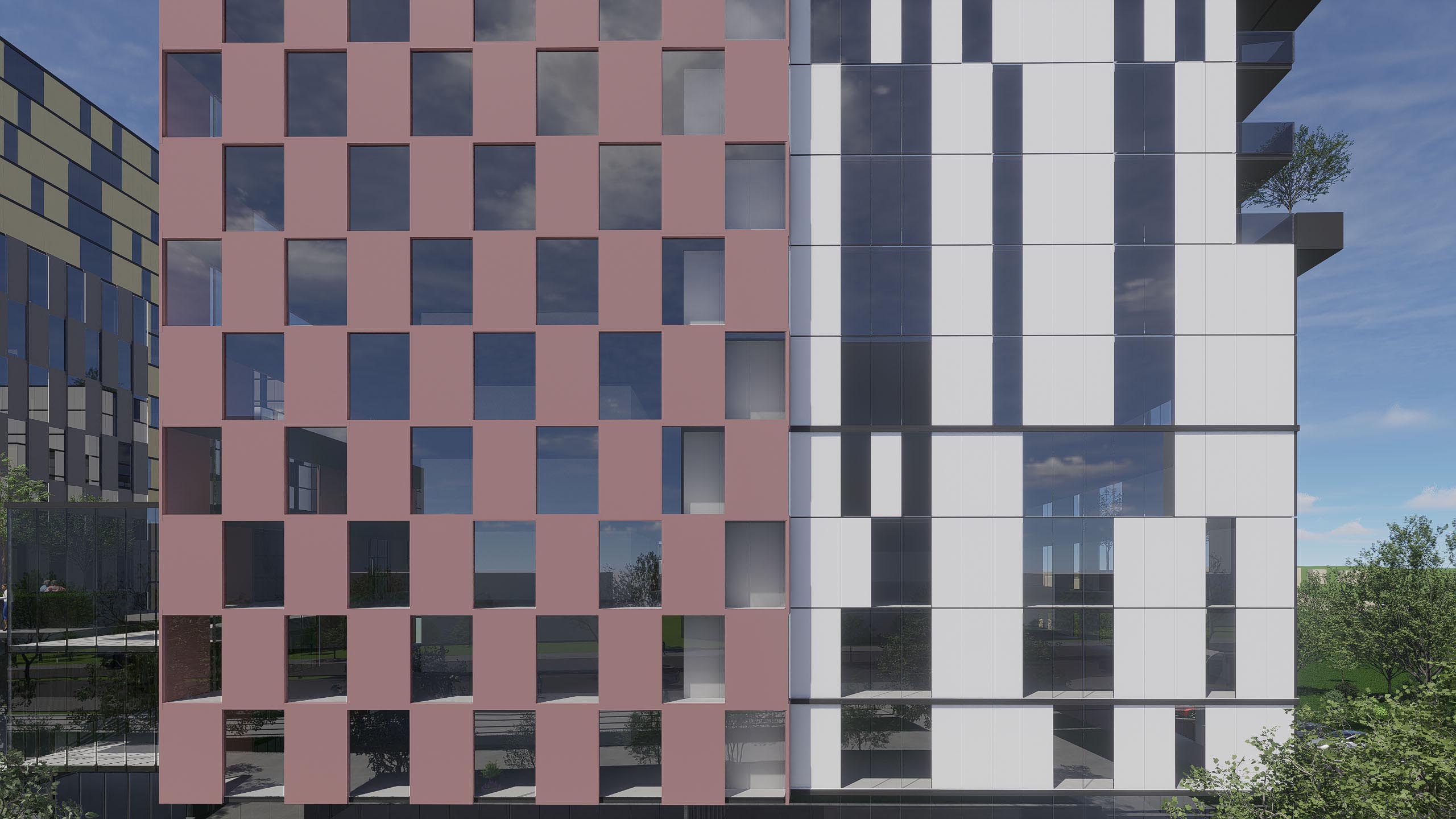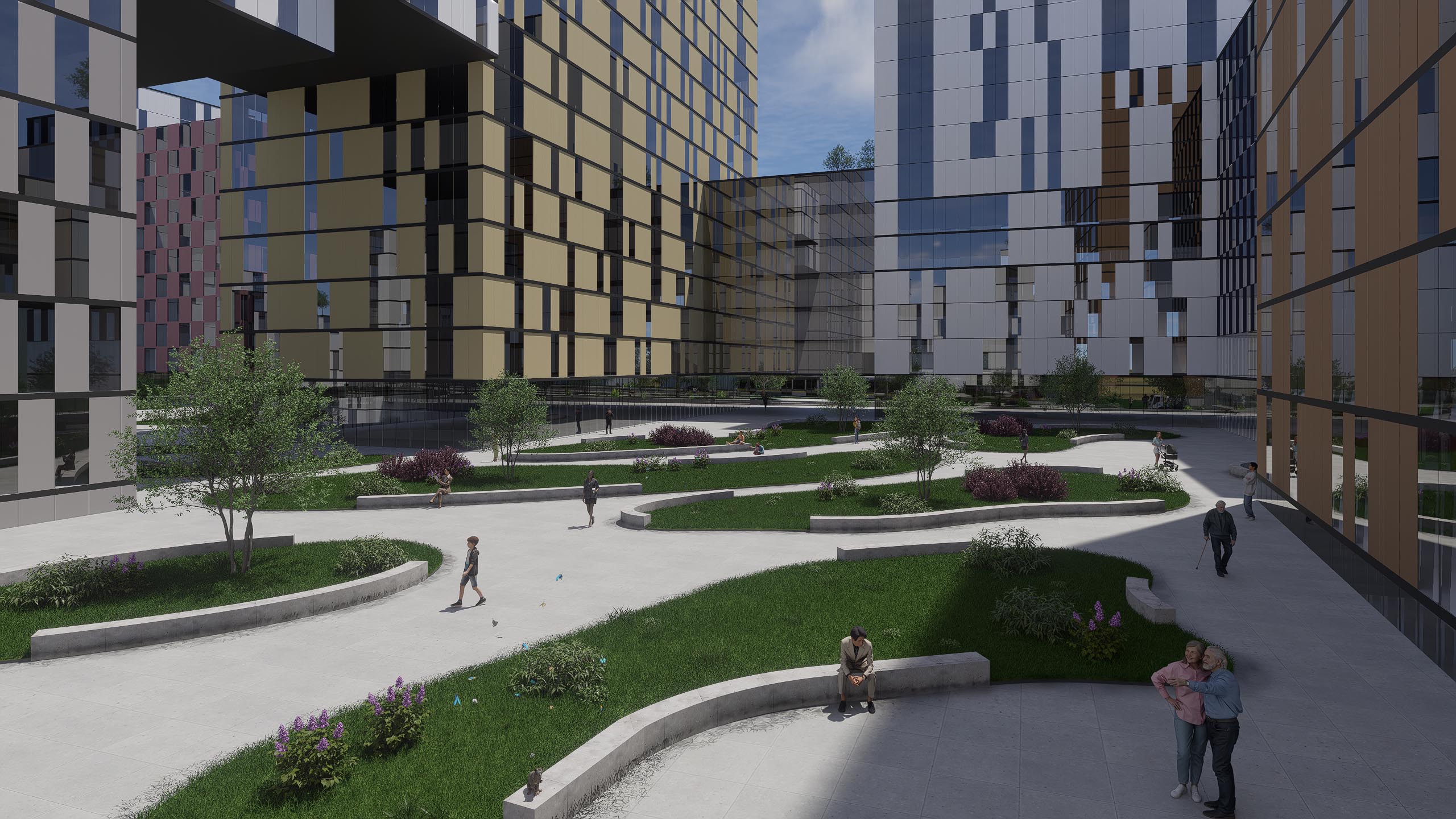The neighborhood is shaped as a porous urban grid, composed of distinct architectural volumes that vary in height, materiality, and spatial rhythm. Each building block maintains a unique visual language — ranging from pixelated facades to elegant terracing forms — while maintaining coherence through a shared design framework.